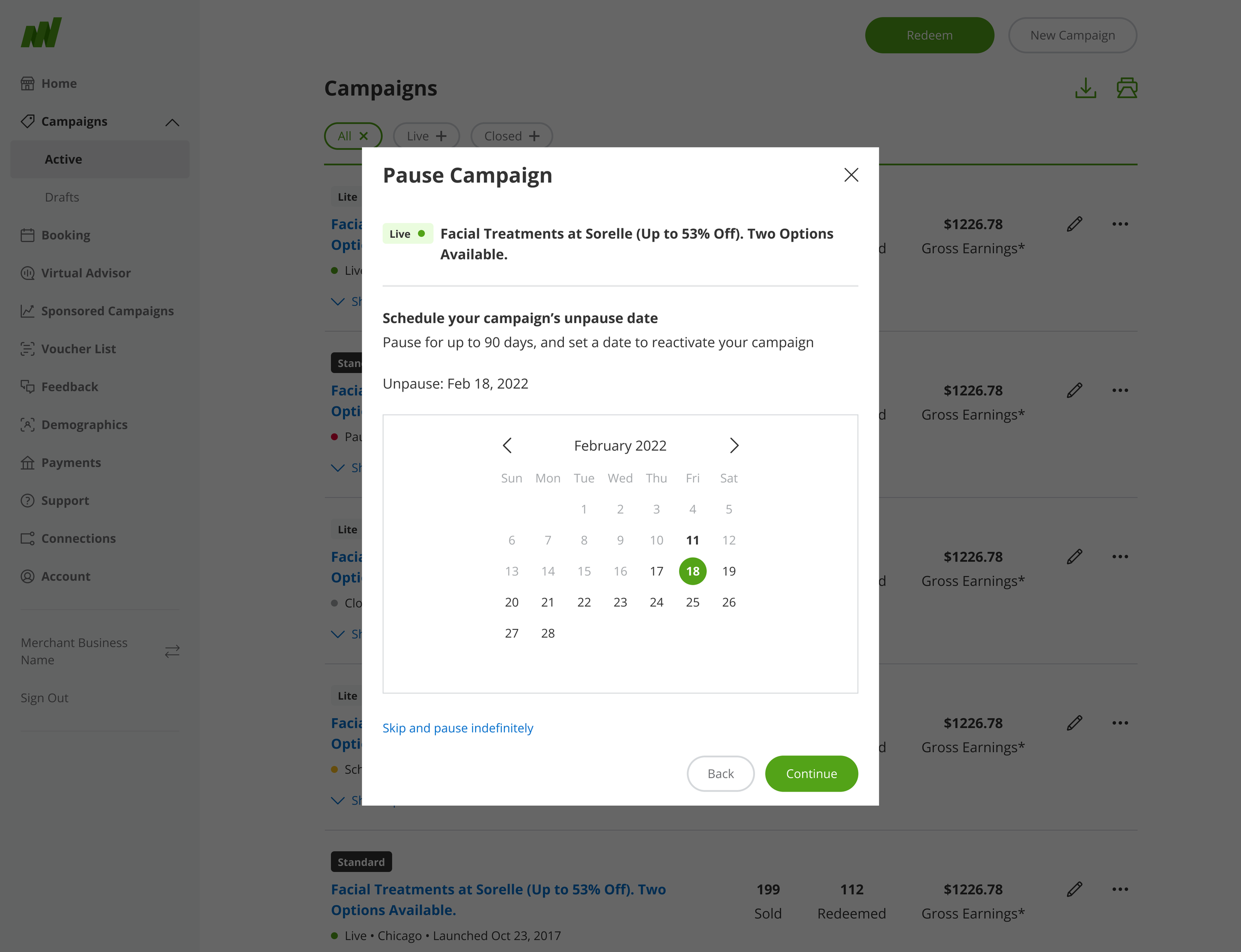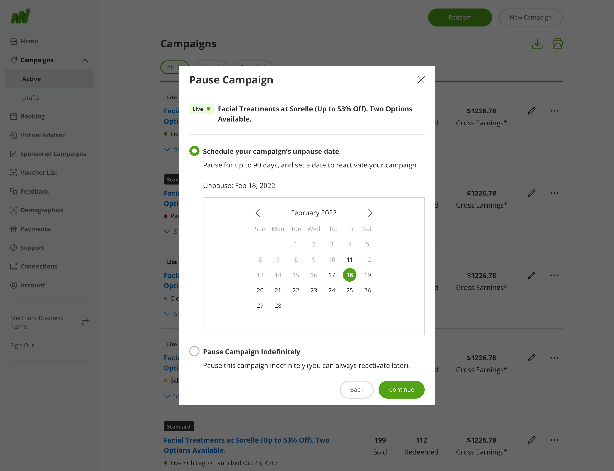 Business owners with deals on Groupon can make changes to their offering with a self-service tool in Merchant Center called Campaign Editor. One feature of Campaign Editor is the ability to pause a deal, making it unavailable for purchase on Groupon’s marketplace.