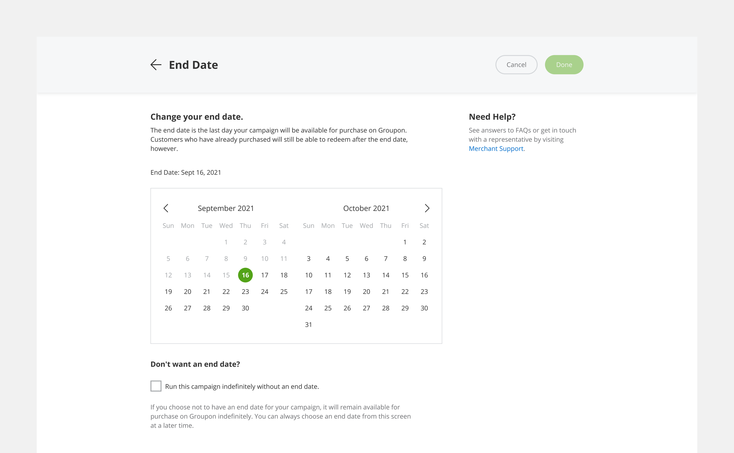 Next I looked at making a temporary pause the default, with the calendar displayed for selecting a restart date. A user could still select an indefinite pause with the text link below the calendar. While this approach would likely keep more deals on the platform, it felt like the option to pause permanently was being minimized. This was not the level of trust I wanted to instill in our merchants.